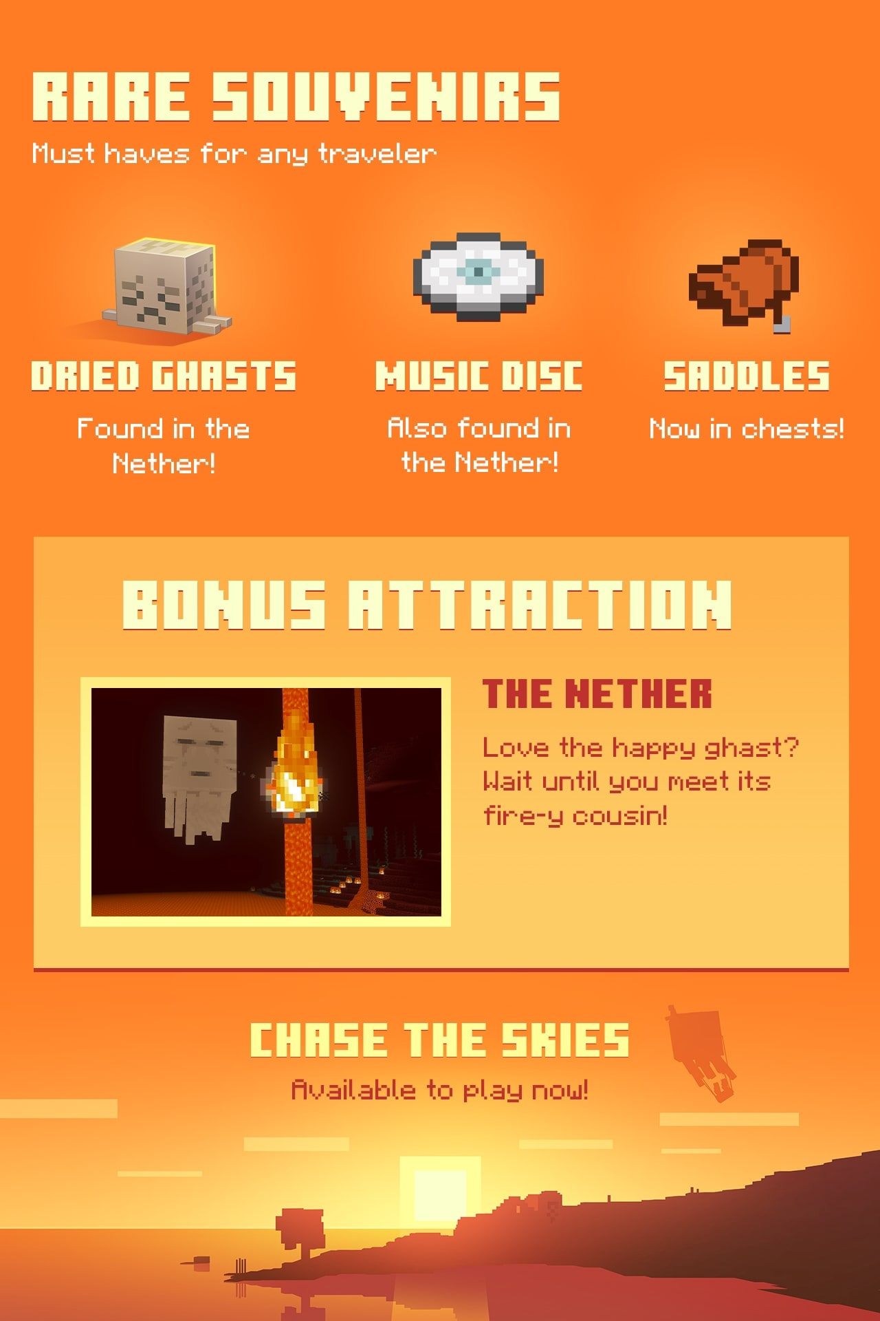 Saddles: Now in chests!Bonus Attraction The Nether: Love the happy ghast? Wait until you meet its fire-y cousin!Chase the Skies Available to play now!