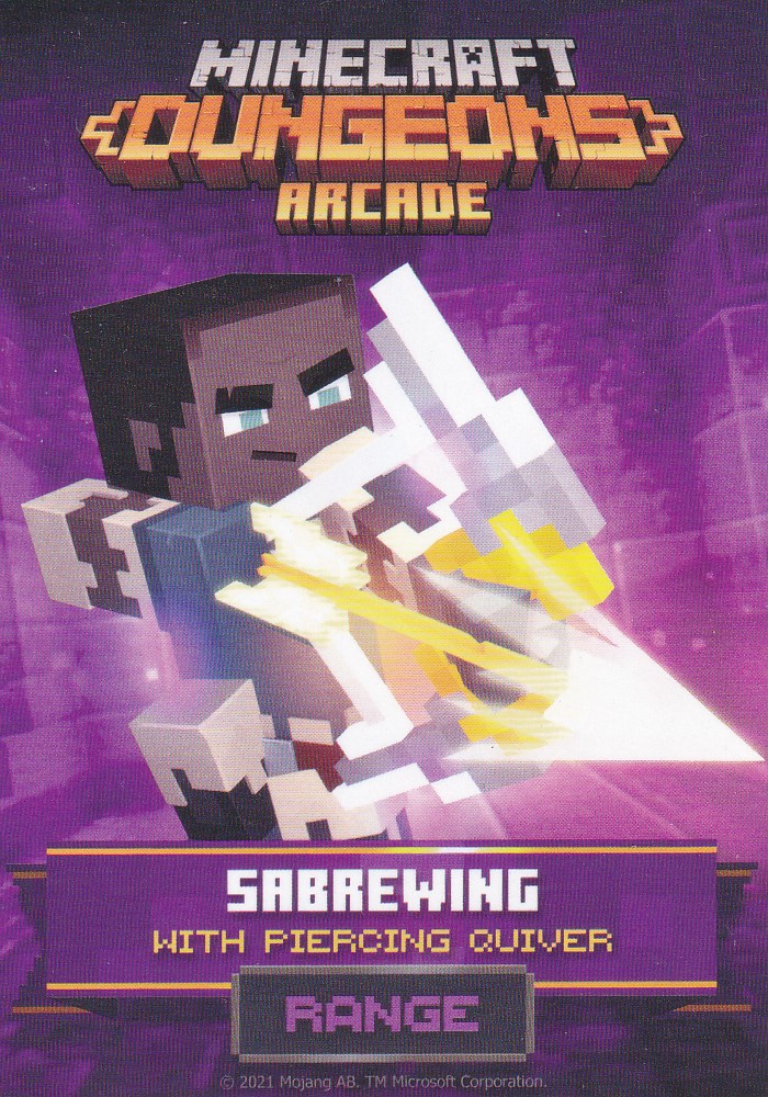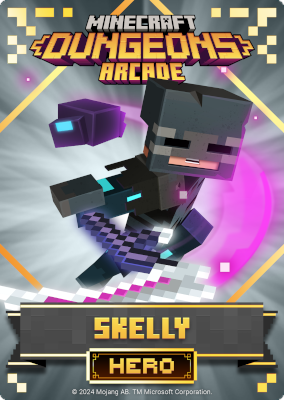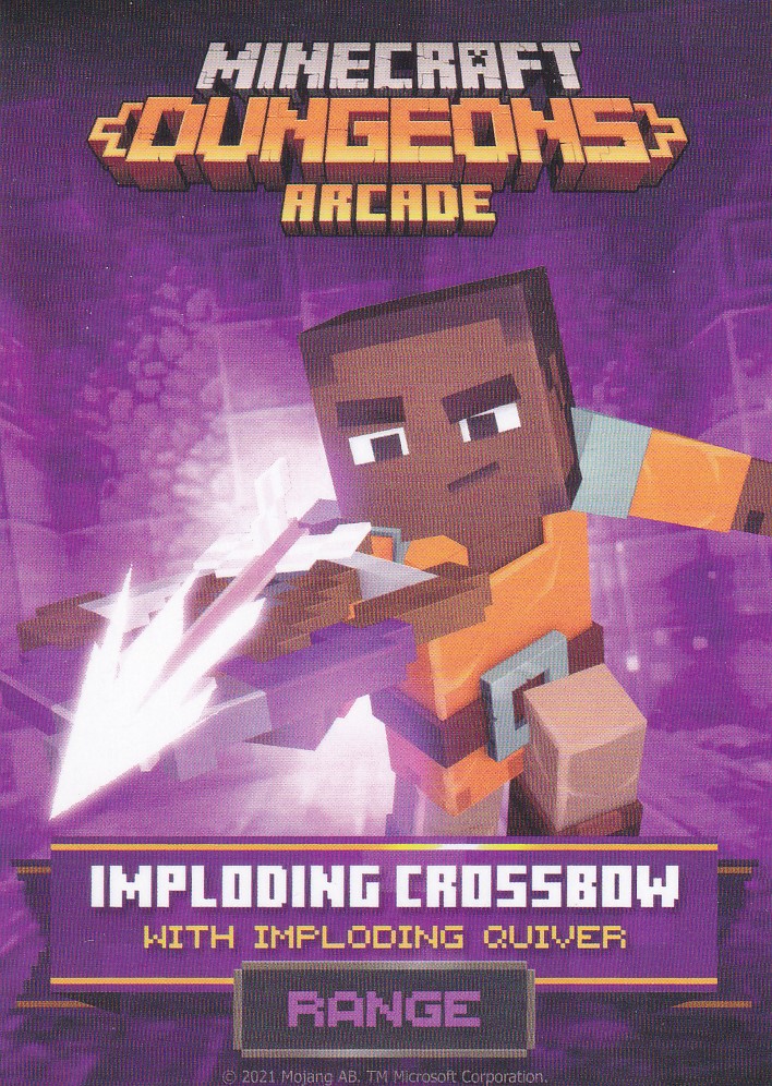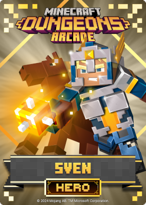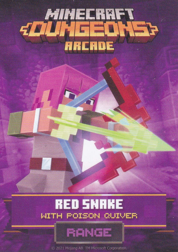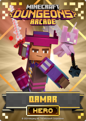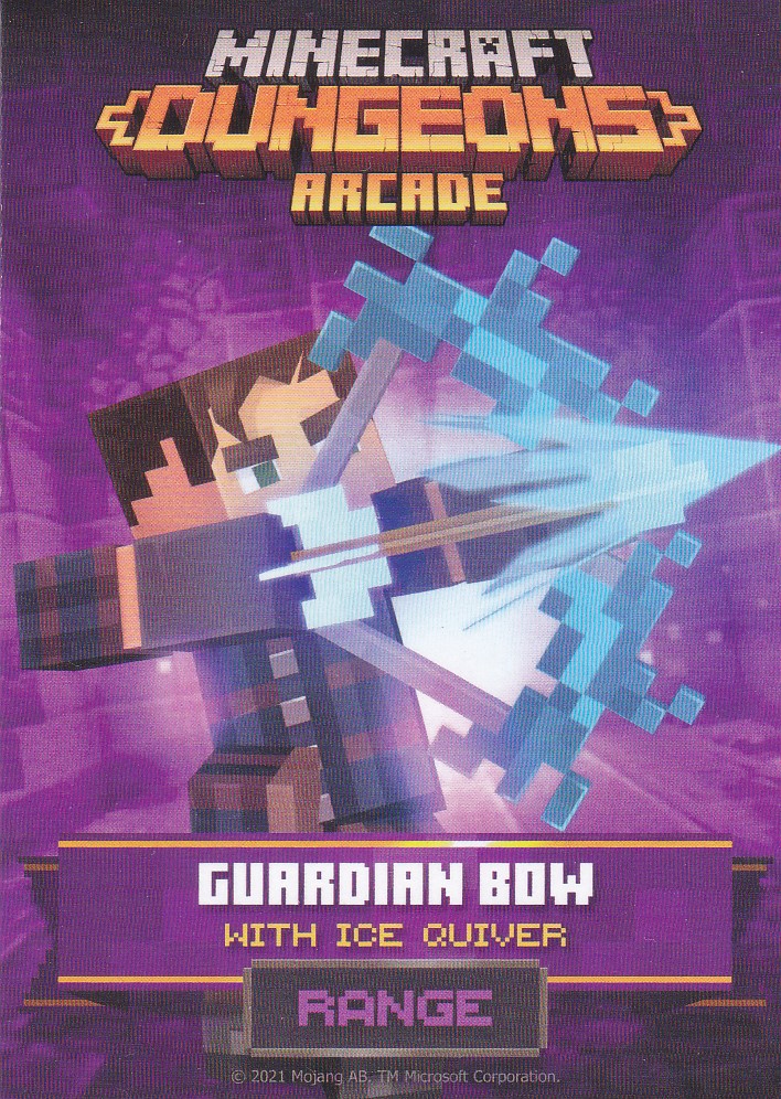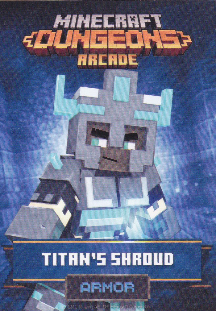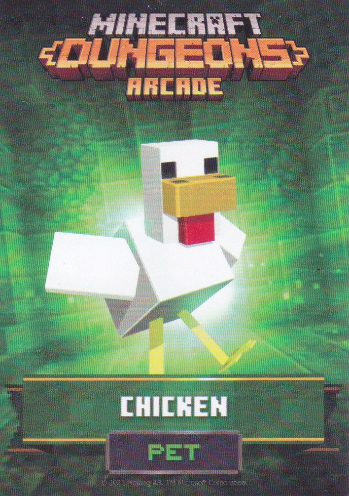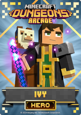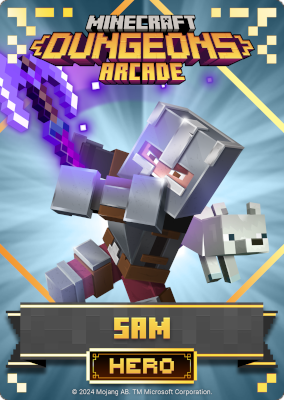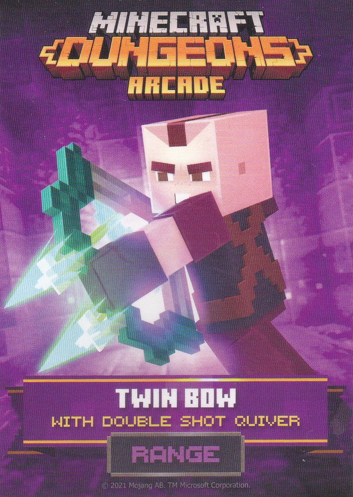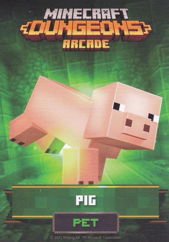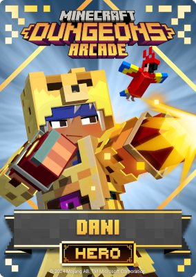 A card is a part of a game mechanic in Minecraft Dungeons Arcade, the arcade adaptation of Minecraft Dungeons. Each time a player starts or continues a game, a card is dispensed beneath their control panel, which can be scanned on the machine's scanners to equip a player with specific weapons, armor, skins, pets and heroes. There are a total of 143 cards to collect: 60 base cards in the first series, 38 cards in the second series, 20 cards in the third series, and 25 cards for the fourth series. Each card also has a foil version, although they have no extra effects on gameplay.