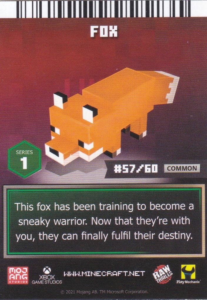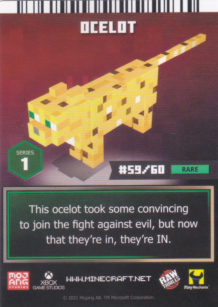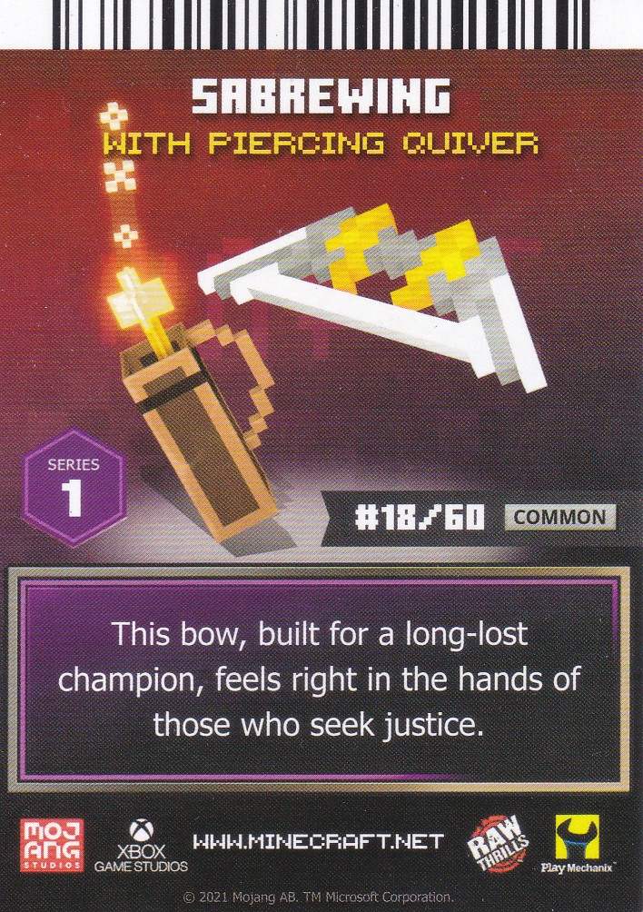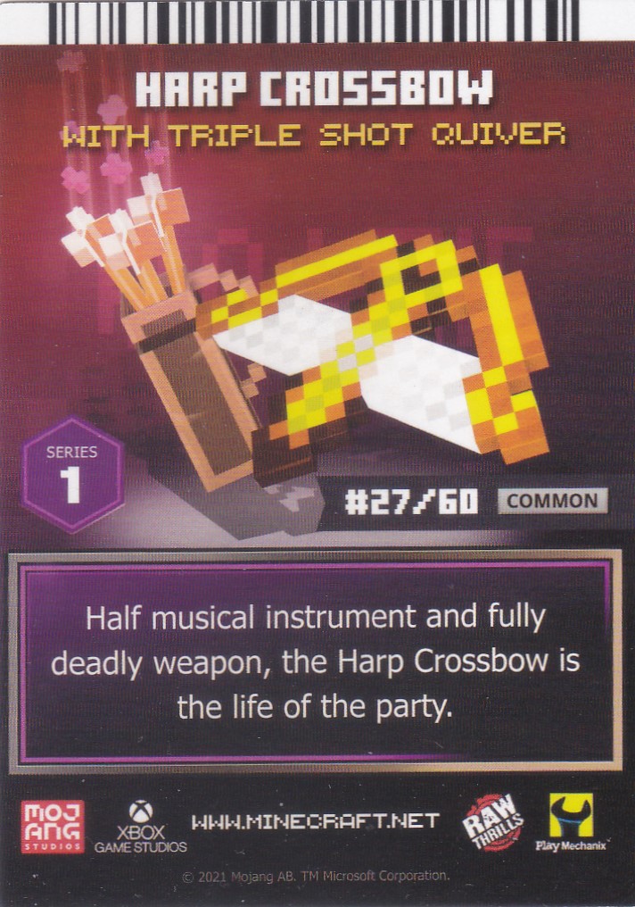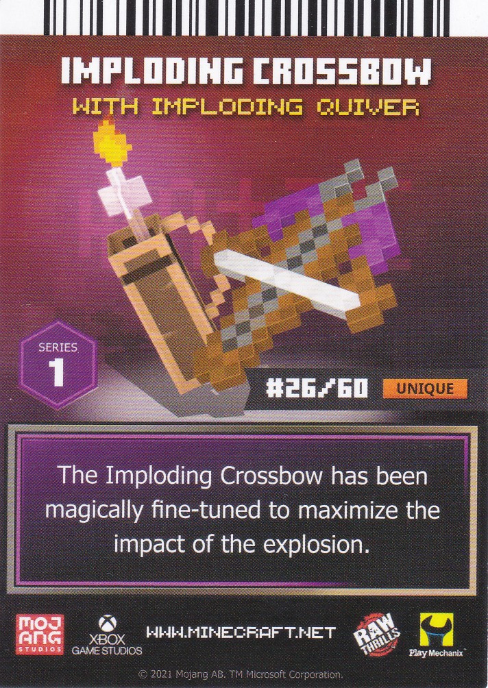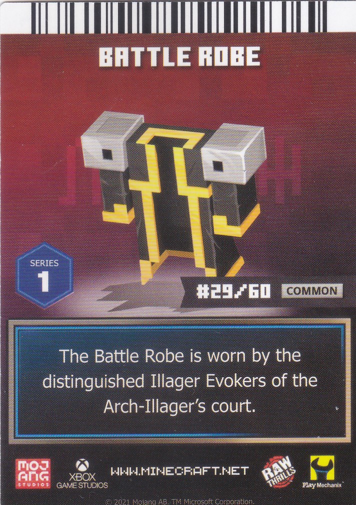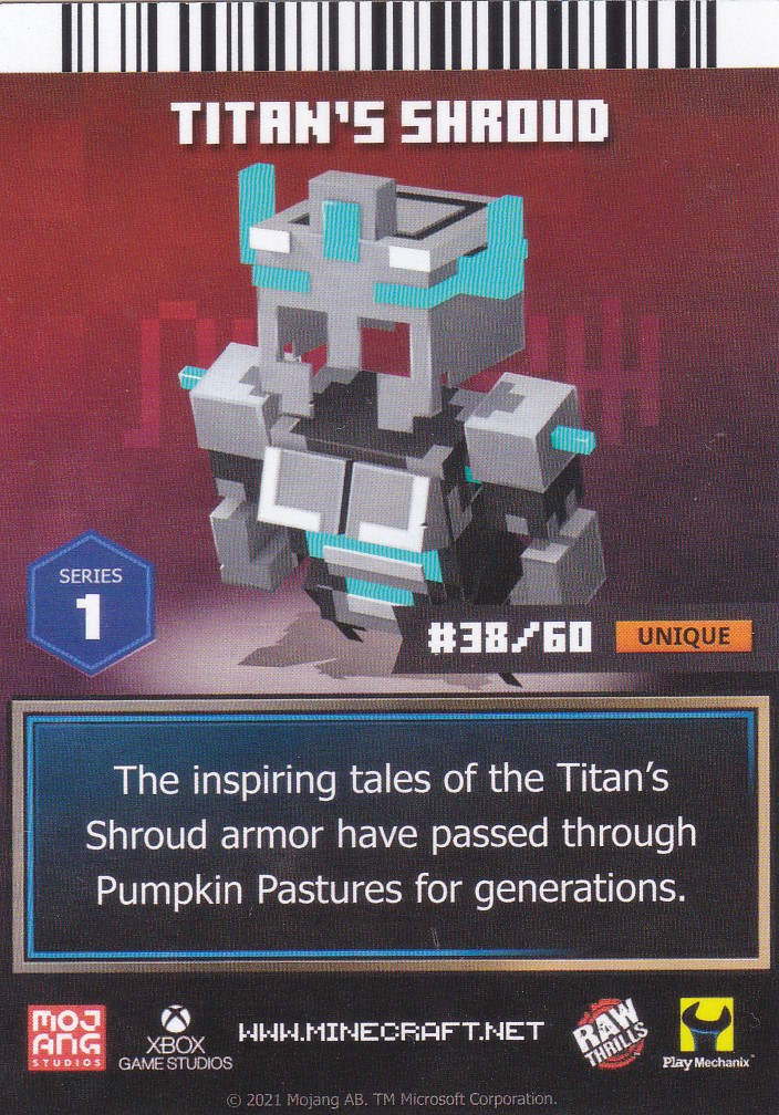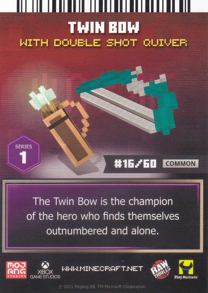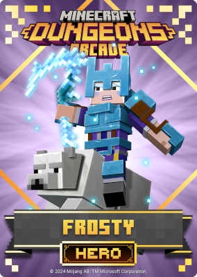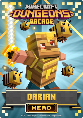 A card is a part of a game mechanic in Minecraft Dungeons Arcade, the arcade adaptation of Minecraft Dungeons. Each time a player starts or continues a game, a card is dispensed beneath their control panel, which can be scanned on the machine's scanners to equip a player with specific weapons, armor, skins, pets and heroes. There are a total of 143 cards to collect: 60 base cards in the first series, 38 cards in the second series, 20 cards in the third series, and 25 cards for the fourth series. Each card also has a foil version, although they have no extra effects on gameplay.