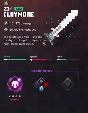 A claymore is a melee weapon that can be found within the various missions of Minecraft Dungeons. Its unique variants are the broadsword, the heartstealer, the great axeblade, and the frost slayer. It is the only weapon to have four unique variants.
