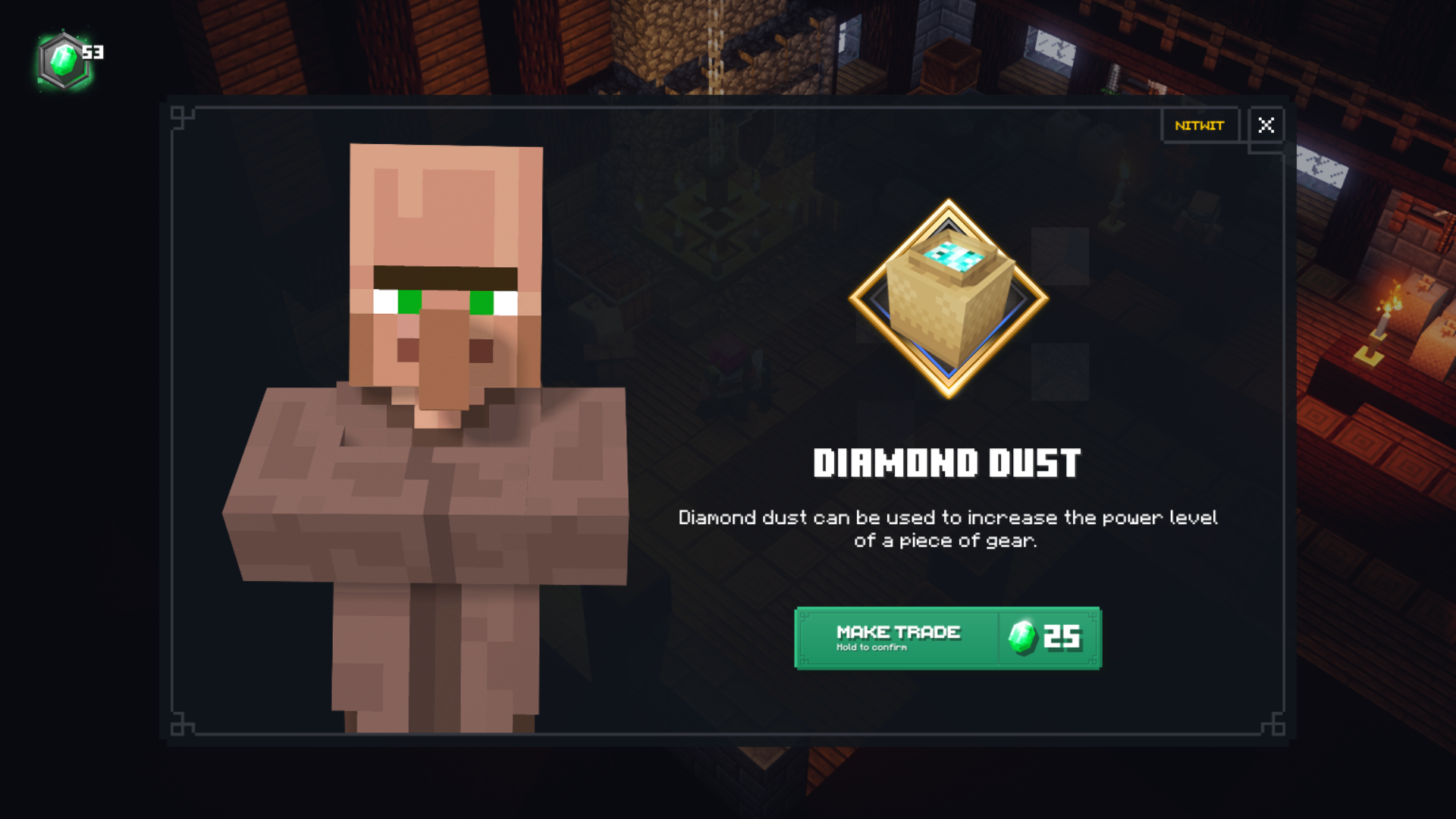 In Minecraft Dungeons Alpha, Diamond Dust can be easily bought (from now unused) Nitwit Villager in exchange for some Emeralds. At the start of the campaign, one Diamond Dust always costs 25 emeralds. However every time we buy another piece, the price goes exactly 10 emeralds up.