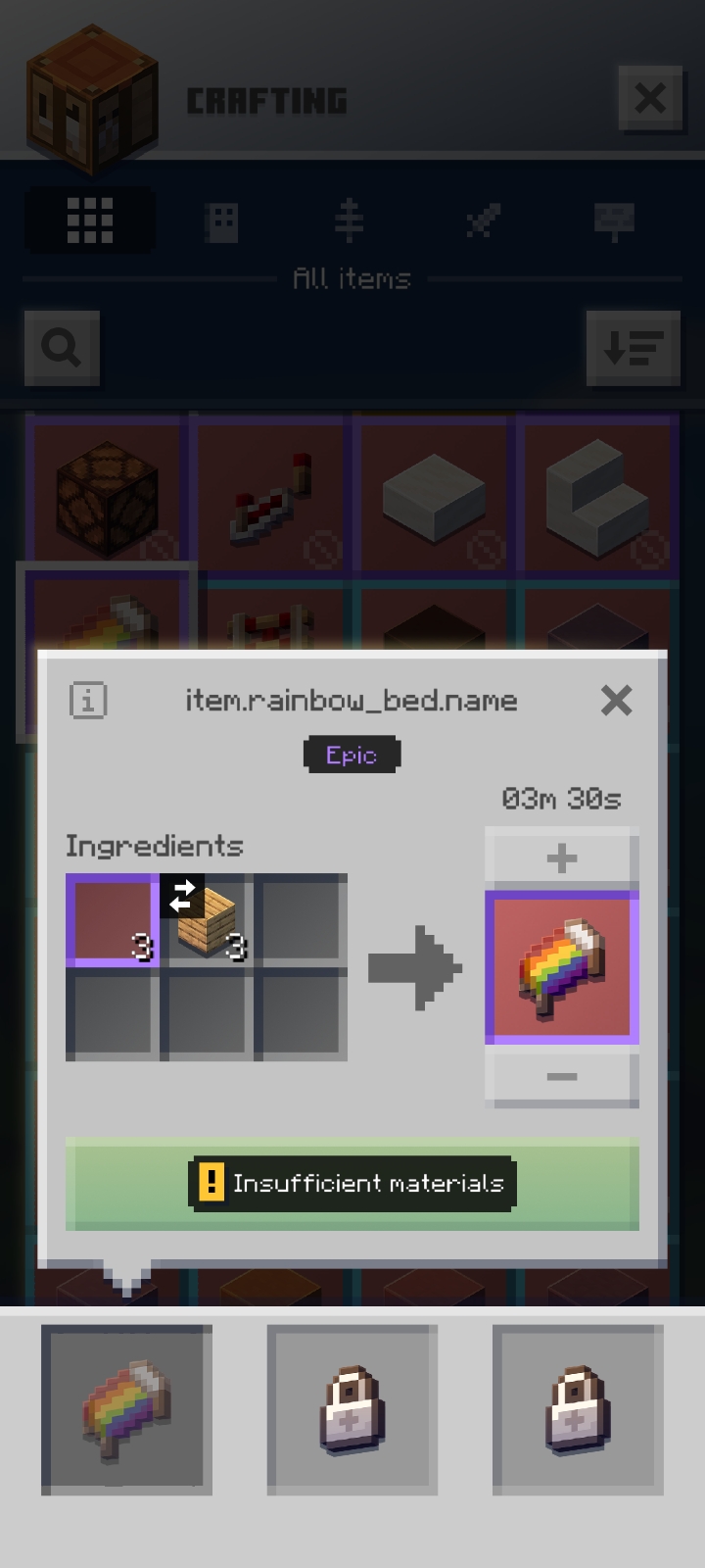 A Rainbow Bed in the crafting menu before it was fully added.