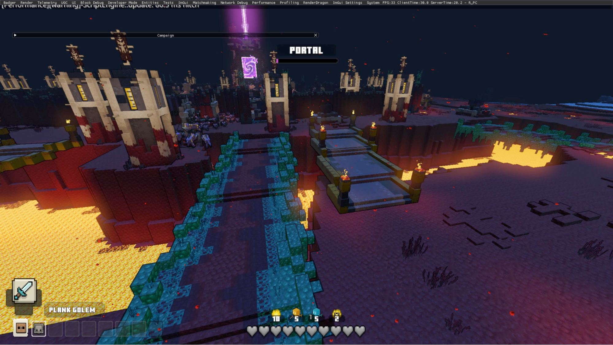 The Night Beacon is a Piglin Base that generates once per campaign that spawns with one layer of walls around the Nether Portal with blaze rod towers on the inner layer and piglin pits on the outside.