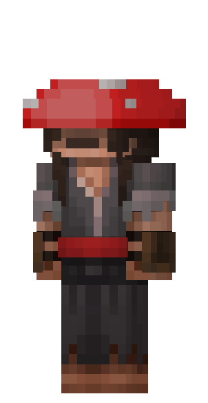 Mo has a red and white mushroom hat covering her black colored eyes, brown hair, light skin, gray mycelium colored tunic, a red belt, brown wrist pads, dark gray pants, and bare feet.