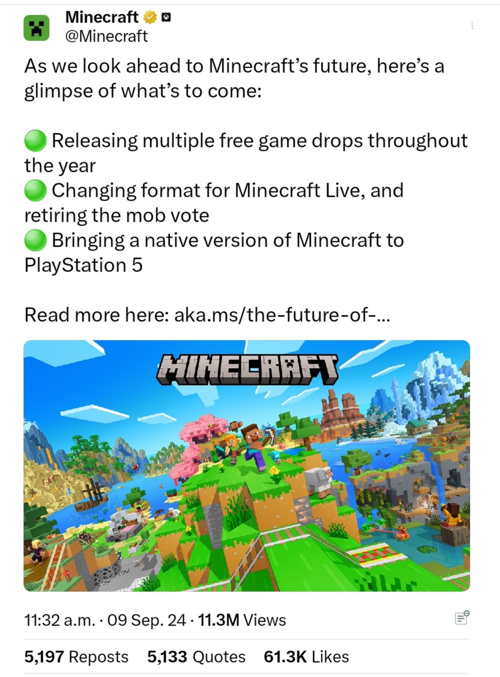 The Minecraft Mob Vote has been officially discontinued as of September 9, 2024, by Mojang Studios. The mob vote was discontinued in 2024. On Social Media, Minecraft announced that they are "retiring the mob vote". In a Minecraft article on the Official Minecraft Website; 'The Future of Minecraft’s Development[1], Section 3; "A new format for Minecraft Live", or Paragraph 7, Ryan Cooper wrote "We’re changing the format for Minecraft Live, and retiring the mob vote, to bring you something new.".