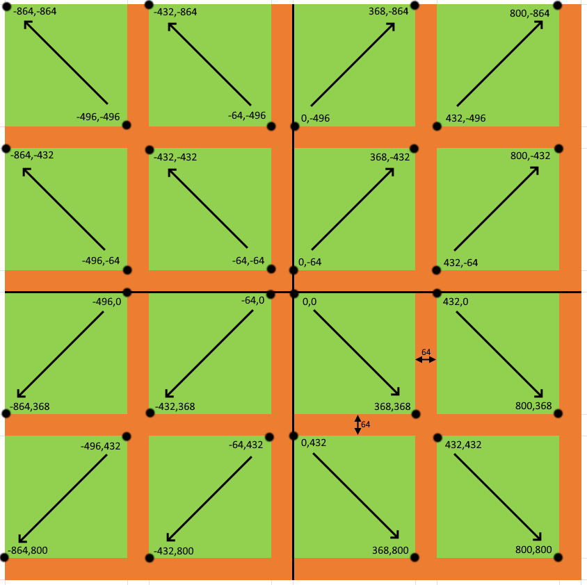 The Nether structure generation in Java Edition. The black lines represent each region and the dots represent coordinates. The green color is where they can generate and red is where they cannot.