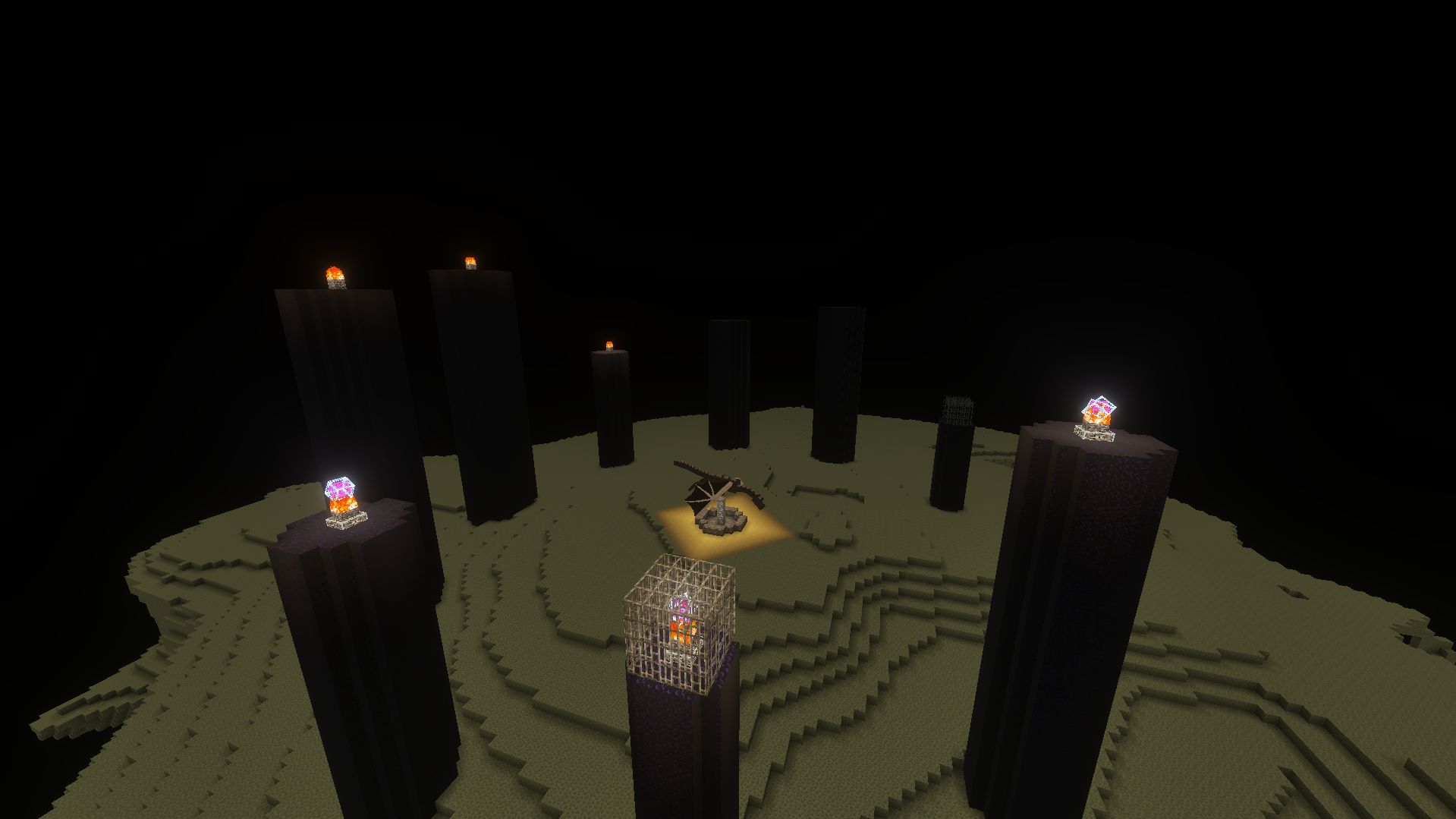 This biome is used to generate the circle of radius 1024 centered at the 0,0 coordinates in the End. The End central island is generated at the center of this circle, surrounded by emptiness all the way to the edge of the biome. Most of the End features are exclusive to here, including the ender dragon, the obsidian pillars, the end crystals, the 5×5 spawn platform, the exit portal, and the 20 central end gateways. Only endermen spawn in this biome, but at much higher rates than the Overworld. There is no weather or daylight cycle in the biome, like the Nether. End gateway portals generate after the ender dragon has been defeated. If the biome is used for a superflat world, the sky appears nearly black, no exit portal generates and endermen are the only mobs to spawn at night.
