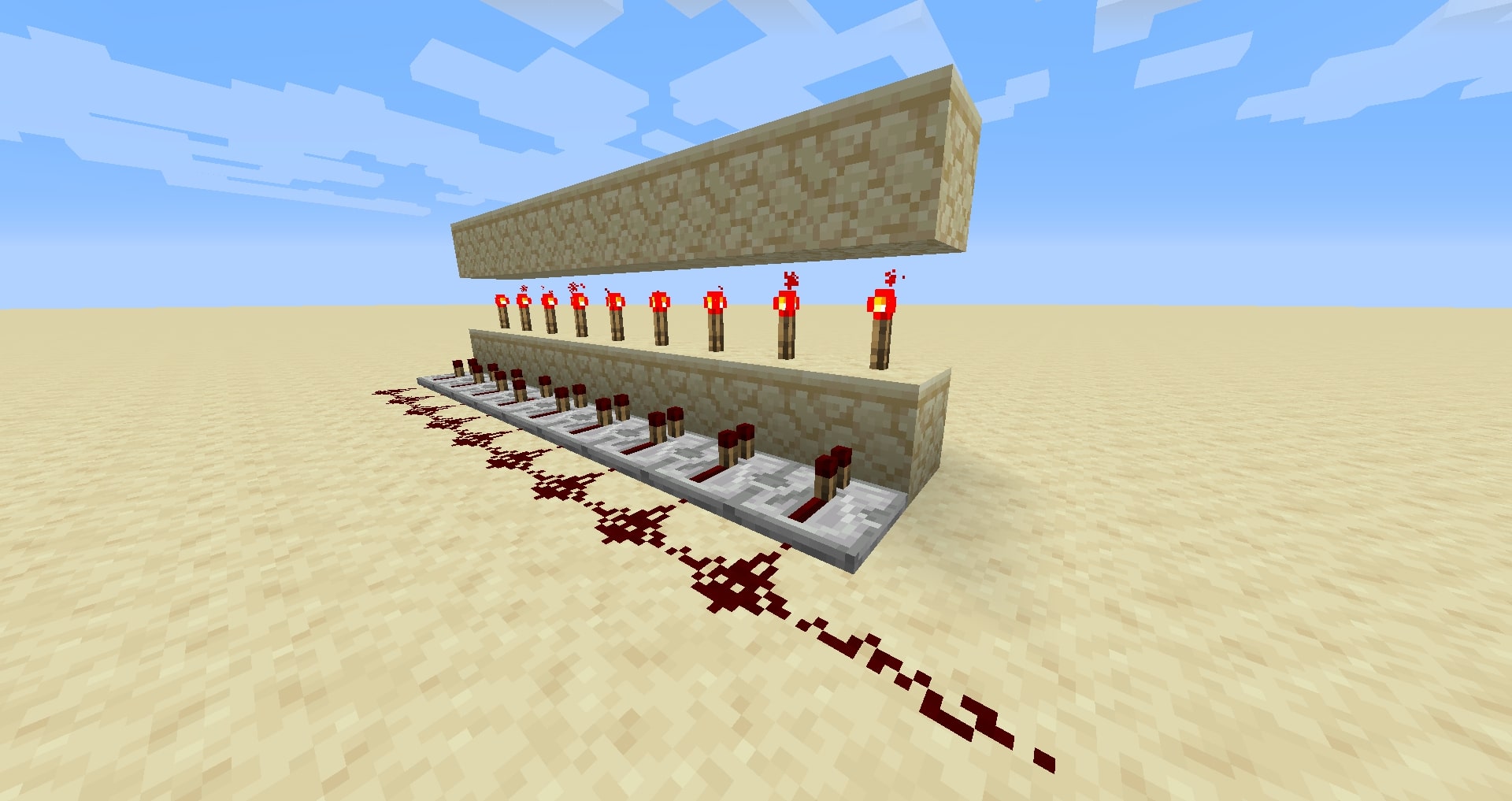 . Now that you've got the repeaters and the lights set up, you want to place wire all along the top of your blocks to the end and then place a torch coming down the side facing where the input came from. As you can see, it has been moved this signal down, inverted it, and then put it to a light which will show the letter.