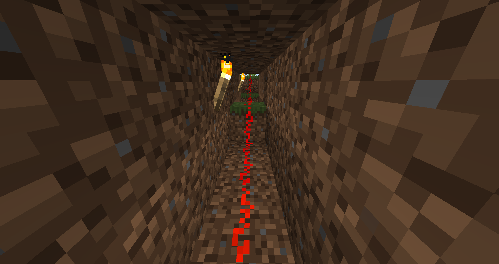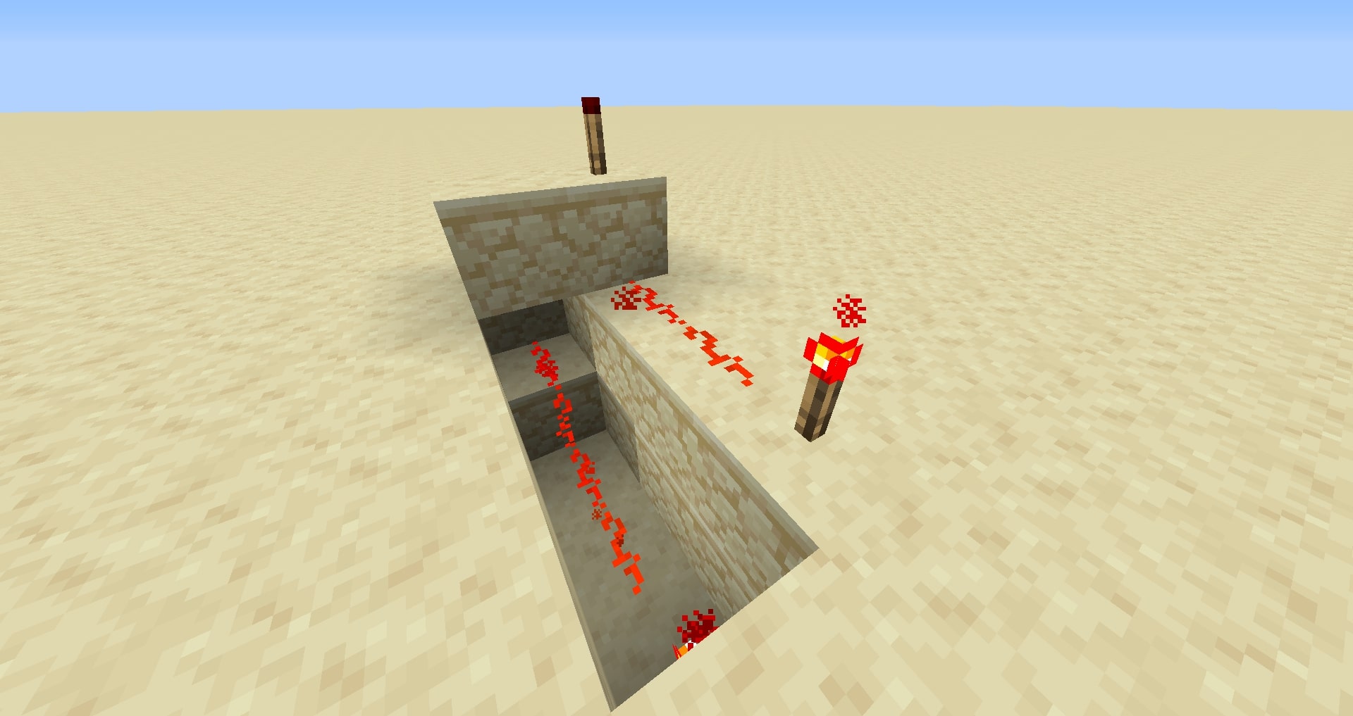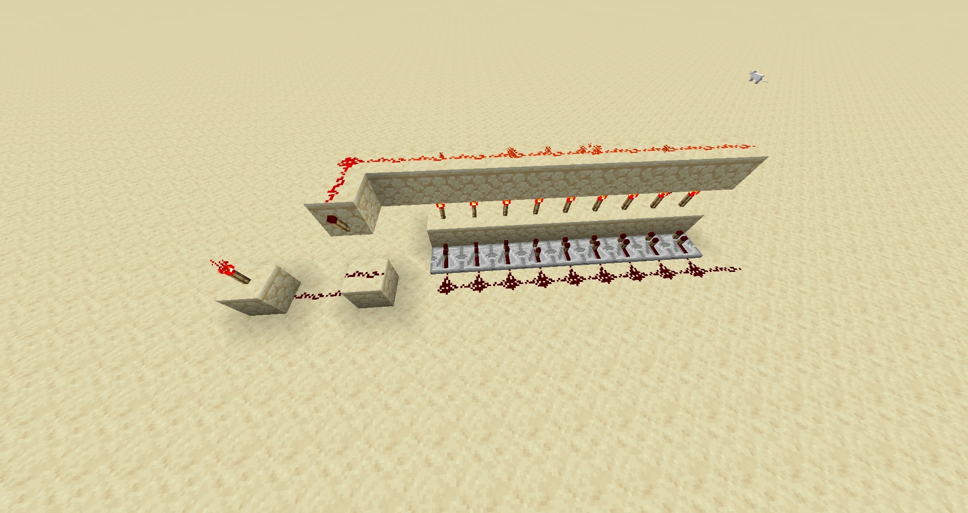 This is the first and gate down. As well as being able to power the block and the wires next to that block, it also powers the wire under nether, you can use this feature to be able to create the next and gate; sort of, but before then, you are going to go through and program the first and gate, now as you have already placed all the torches it is now quite easy to program in, basically you want to pull up your Morse code showing you the different signals and then remove the torch that is it meant to be, remember that it will go in pairs, dash dot, dash dot, dash dot and so on, so to program in A which is dot dash you need to remove the 2nd and the 3rd torch. It is very important to make sure you get the right end display. Although, it can always be done at the end, or with the next step, which is to create the second and gate, this will in the end mean that the signal will only be on when all the criteria is full filled, to stop any of the incorrect lights showing. Now, to do this you are going to want to remember where the gaps are in the torches, for example, by giving the gaps all numbers and writing down which ones are empty. It is suggested to do this row by row. Create a trench directly underneath the torches two deep, and now for everything gap that you had place a block and a redstone wire on to it and feed the redstone wire overall of them to the opposite end of the torches away from where your display is. This is what 'A' would look like underneath, now you want to get this message up to the top layer of your row, where the redstone wire is. You do this using vertical wiring and then feeding a wire to connect them both up, like this. Once this is all connected up to each one, you're complete you should now go test your system for any mistakes.
