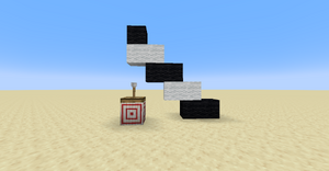 Zbuduj wieżę wysoką na 5 bloków ponad tarczą strzelecką, a na wierzchu tarczy umieść [[Klapa|klapę]]. Stań na szczycie wieży i strzel pionowo w dół kilka-kilkanaście razy, tak, by strzały trafiały jak najbliżej środka klapy. Powinno to wyglądać w taki sposób: | |||